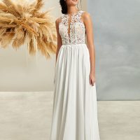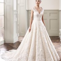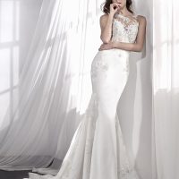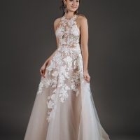 Talk about a show-stopper! Monique Lhuillier Sunday Rose is a dramatic and romantic wedding dress. Created in silk satin organza the dress features intricate (and stunning!) roses throughout the A-Line skirt.