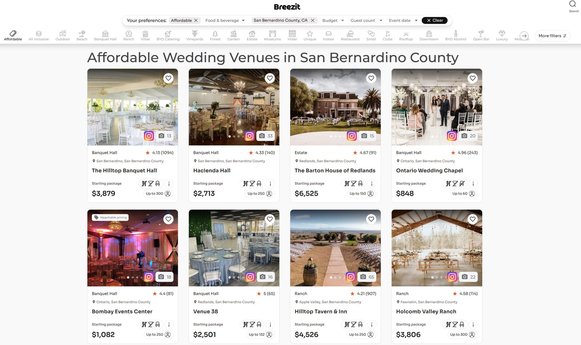 If you’re indeed planning a wedding in Southern California, don’t waste time scrolling through endless directories. Venue search tools such as Breezit make it super simple to find venues based on your budget and location, so you can compare options quickly and move on with your planning.