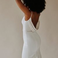 A deep-V neckline, a high slit and beautiful beading, it’s the ultimate design that features both couture qualities and bridal details.