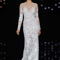 Inspired by the magical myth of fairies, this stunning long-sleeve wedding gown from Zuhair Murad’s Fall 2023 bridal collection allows you to flaunt your body in a sexy-chic way. The figure-hugging silhouette and sheer fabric leaves little to the imagination, but still embodies romantic elegance through the all-over applique detailing.