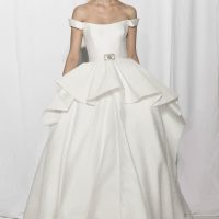 Another haute couture design, this time by world-renowned designer Galia Lahav. This off-the-shoulder, trumpet-corset wedding gown, titled “Veronica”, is here to make a statement. The sheer side panels and sheer back lead the top of the gown while the voluminous, ruffled-tulle layered skirt steals the show at the bottom. There’s no doubt that this ultra-sexy wedding gown will be talked about for years to come.