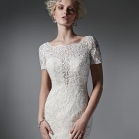 Our final gown isn’t a gown at all, but a sexy jumpsuit from Michael Costello. It’s a great way to allow your curves to shine through a body-hugging silhouette. The sheer lace bodice and sleeves are ultra-sexy features and the velvet waist tie just accents the scalloped lace v-neck. We love this option for the modern bride who wants to sizzle yet stay comfortable on her wedding day.