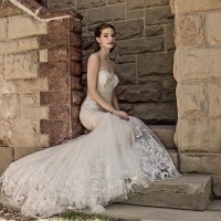 Another haute couture design, this time by world-renowned designer Galia Lahav. This off-the-shoulder, trumpet-corset wedding gown, titled “Veronica”, is here to make a statement. The sheer side panels and sheer back lead the top of the gown while the voluminous, ruffled-tulle layered skirt steals the show at the bottom. There’s no doubt that this ultra-sexy wedding gown will be talked about for years to come.