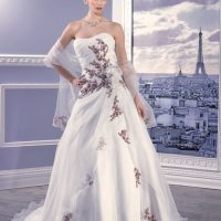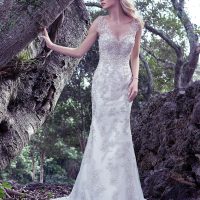 We’re a sucker for semi-sheer detailing, so this fit-and-flare gown by Mon Cheri is perfect for the bride who wants to sizzle while still feeling elegant. The beaded Schiffli lace and semi-sheer bodice and skirt is stunning and romantic. To add just a touch of modesty, the short skirt and bodice lining will make any bride feel a little more comfortable throughout the day.