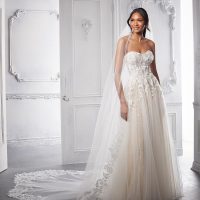 This fit-and-flare style is covered in embroidered tulle over lace and a full godet skirt flows right into the court train.