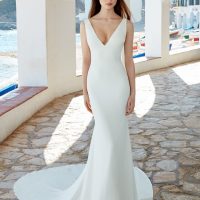 Sleek stretch crepe fabric hugs the bride’s curves in this seamless, sheath silhouette.