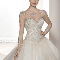 This illusion long-sleeve gown starts with a semi-constructed bodice while sparkly floral botanical embroidered lace wraps around the bride’s body before cascading down the elegant skirt.