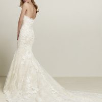 Skilled seamstresses placed these lace panels throughout the fitted bodice and all over the skirt creating a magical boho-chic wedding dress that is sure to amaze your guests. Make sure not to miss the decorative, Aztec pattern along the plunging v-neckline that embodies the southwest.