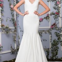 Marchesa designers Georgina Chapman and Keren Craig like to filter their vision of femininity through a rose-tinted lens. The embroidered, colorful gowns feature laser-cut petals, floral embroideries, and shimmering leaves layered with rainbow-hued petal appliqués that flutter with every move. The luxurious fabrics, delicate silks and elegant silhouettes would make any bride feel pretty and powerful.